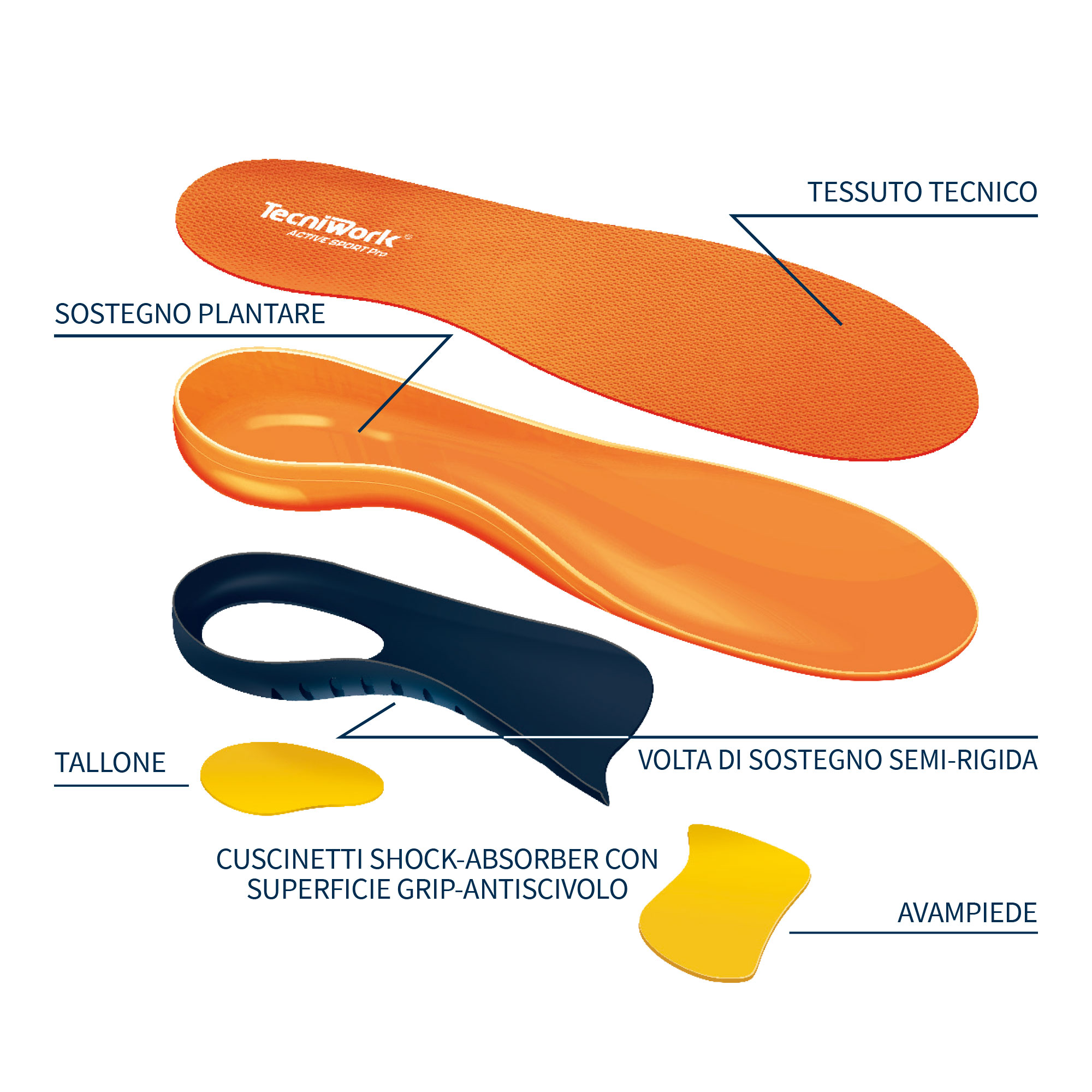 Ideali per lo sport e il tempo libero, la soletta sostiene attivamente l’arco plantare, protegge e ammortizza efficacemente. Con volta di sostegno semi-rigida sottile e conformabile al movimento e cuscinetti shock-absorber che ammortizzano avampiede e tallone. Rivestita in tessuto resistente all’abrasione e all’usura.